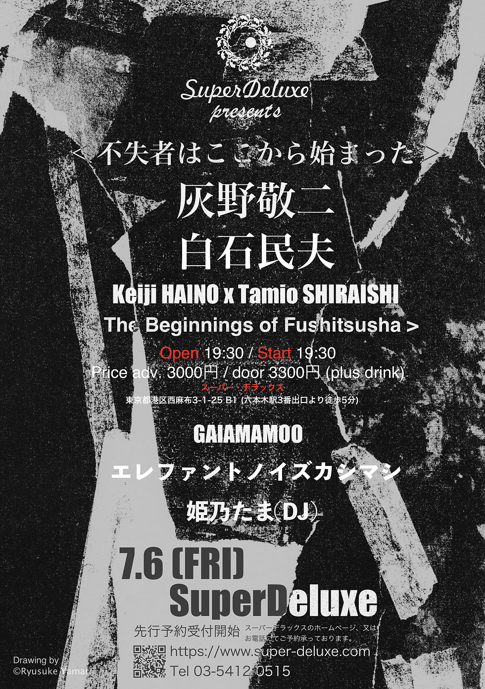 GAIAMAMOO Live @ Super DeluxemehatahiroshiMay 26, 20181 min read 7/6(Fri) こちらのLIVEに出演させてもらいます。チケット予約は以下のURLから行えます。 不失者はここから始まった https://www.super-deluxe.com/room/4496/開場 19:30 / 開演 19:30料金 予約3000円 / 当日3300 (ドリンク別)出演: 灰野敬二 × 白石民夫《不失者はここから始まった》 GAIAMAMOO エレファントノイズカシマシ DJ: 姫乃たま